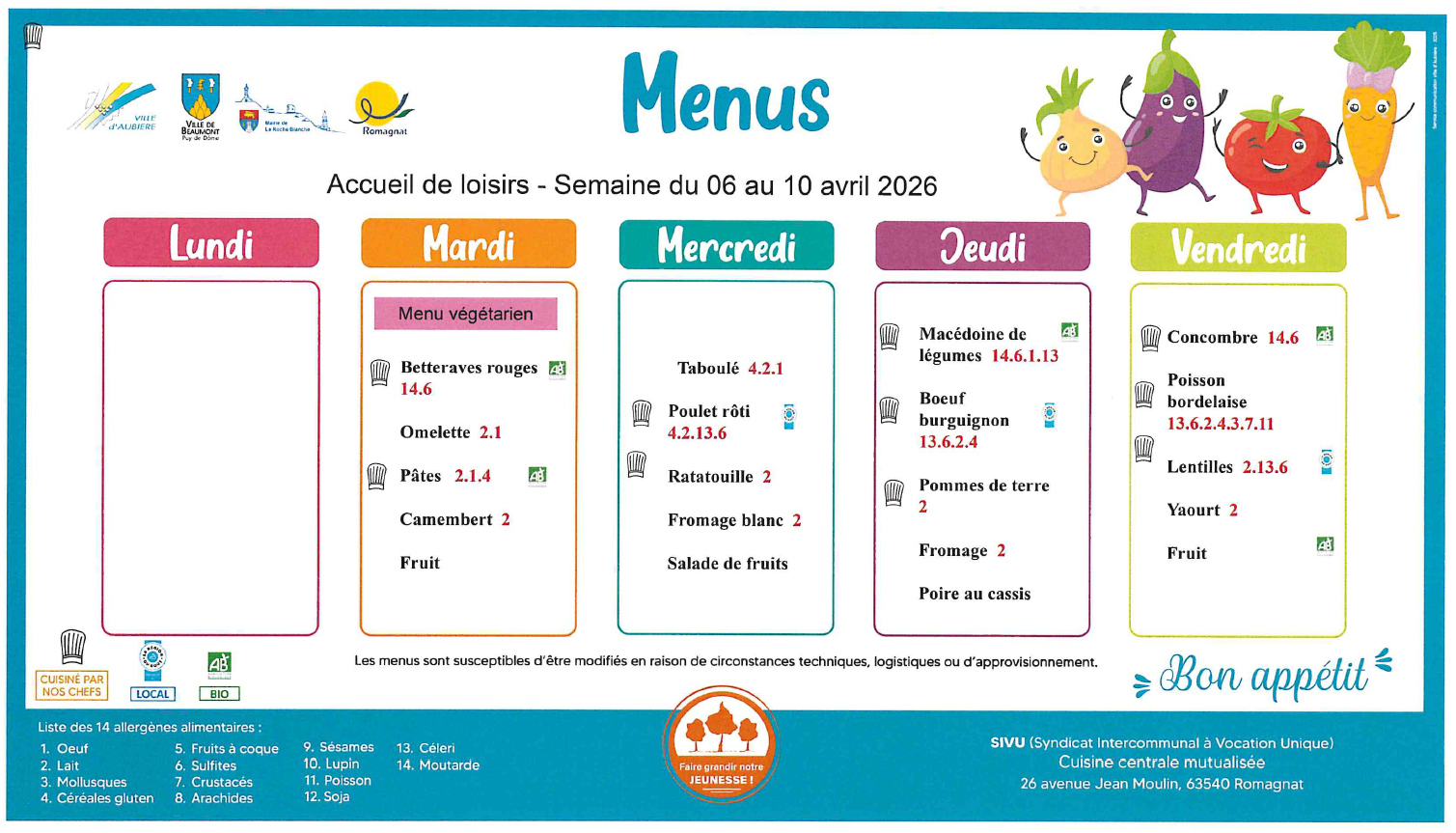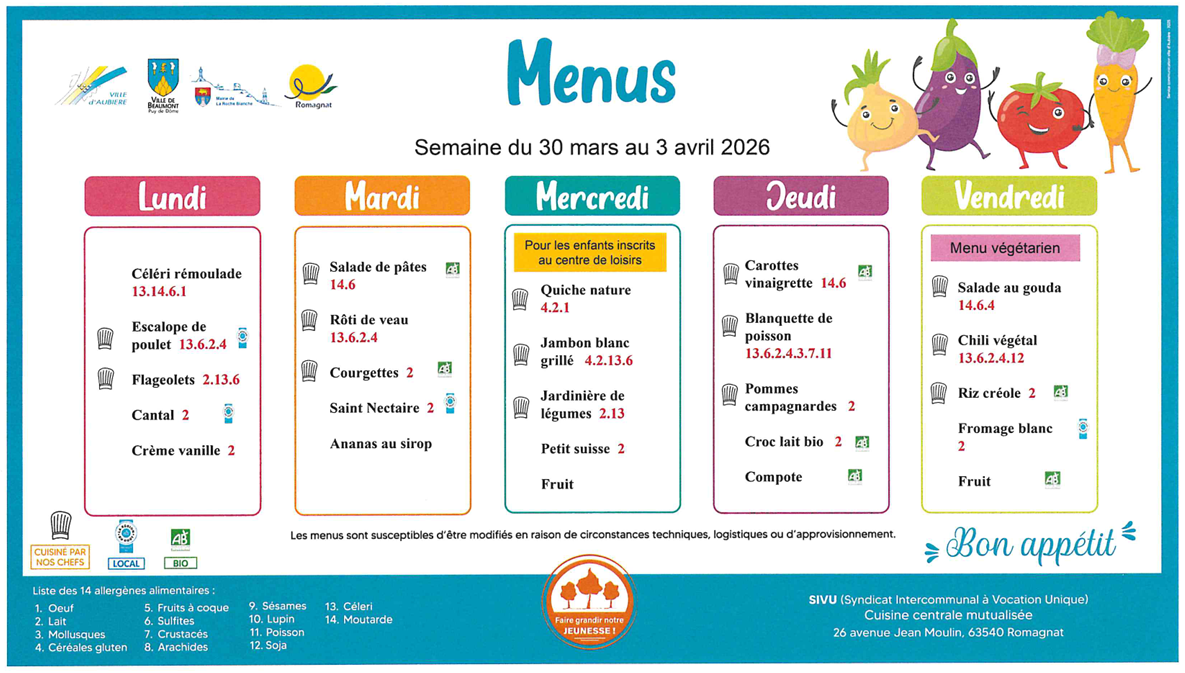 Menus des restaurants scolaires Menus de la semaine 15 - 6 au 10 avril 2026 : Menus de la semaine 14 - 30 mars au 3 avril 2026 :